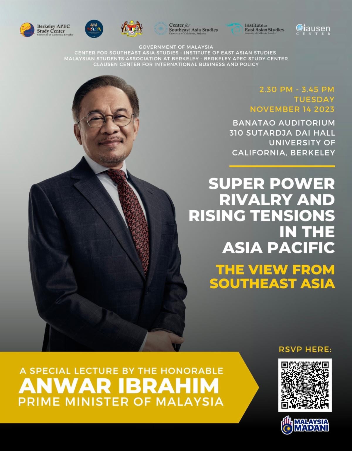 This comes courtesy of the Center for Southeast Asia Studies, in partnership with the Berkeley APEC Study Center, Institute for East Asian Studies, Clausen Center, the Malaysian Students Association and the Government of Malaysia. Prime Minister Ibrahim’s remarks will be followed by Q&A with Prof Vinod Aggarwal.