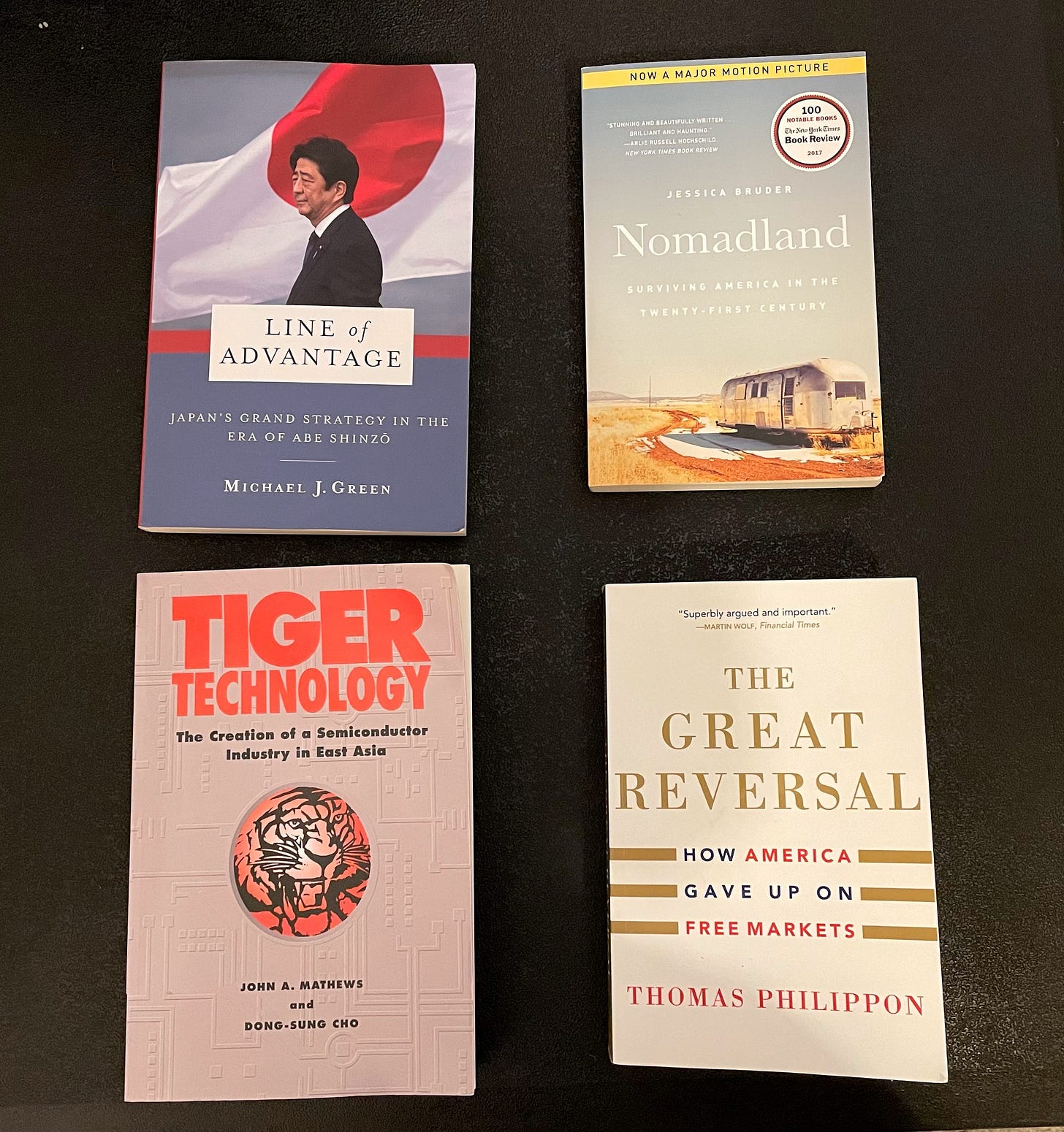 This logically tees up Henry Yeung’s Interconnected Worlds, on electronic production networks (Yeung’s term), which came out in 2022. Yeung visited Berkeley in May, and thus I finally got to reading Tiger Technology in preparation for his talk and book. Post-talk victuals are depicted below. Thanks to Vinod Aggarwal and Dylan Davis for the invite.