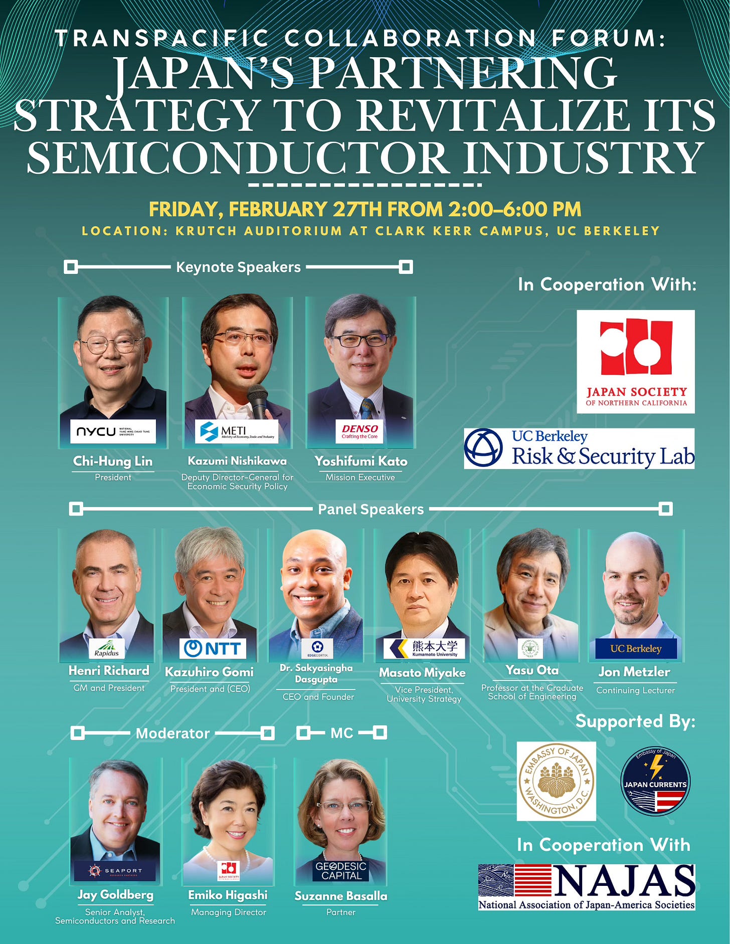 UC Berkeley Risk and Security Lab and the Japan Society of Northern California, with support from the Institute for Business Innovation at Berkeley Haas, have partnered to host the first Transpacific Collaboration Forum, to highlight collaboration across semiconductor supply chains between Japan, Taiwan, and the US. It’s happening Friday February 27 at the University of California, Berkeley.
